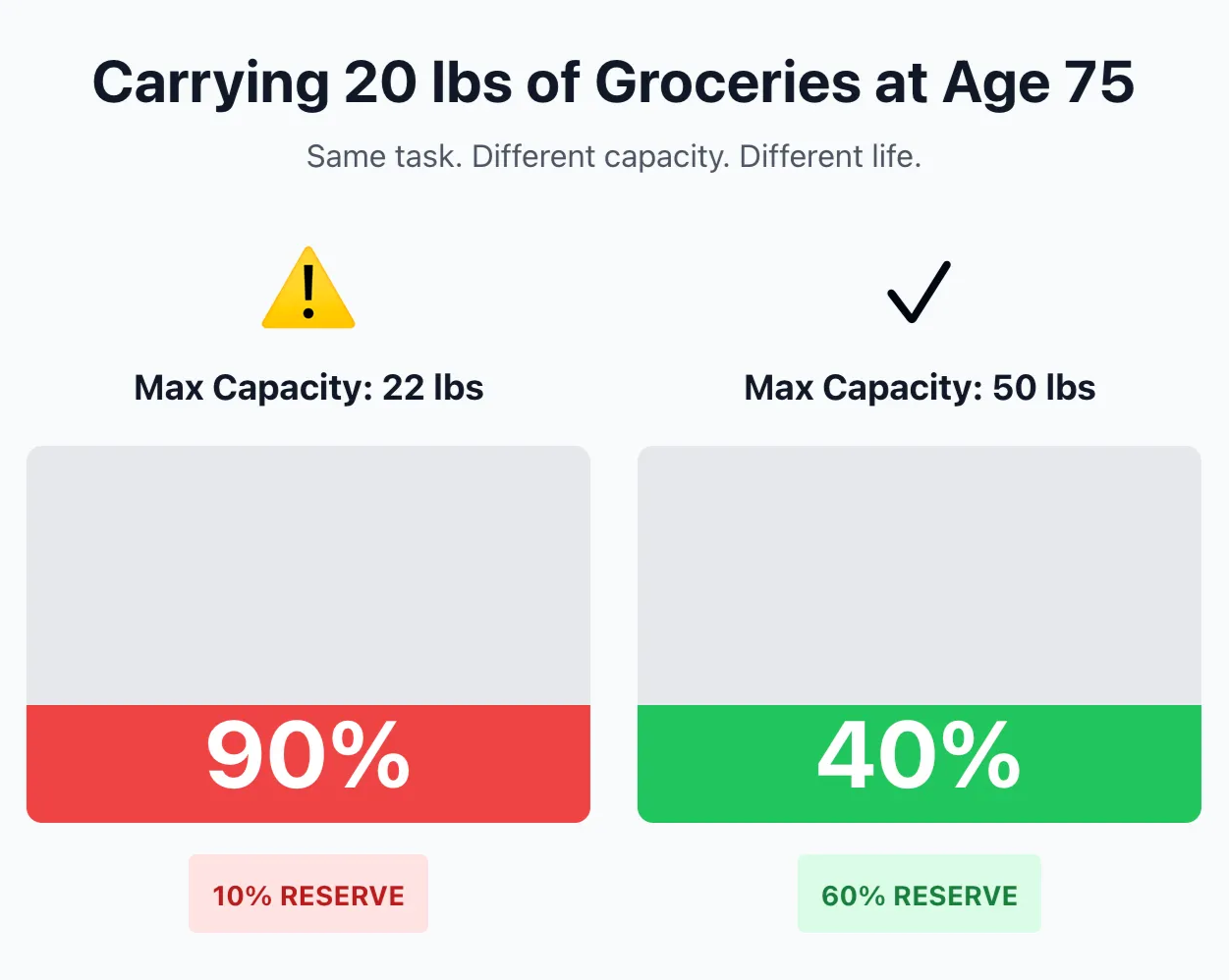 After age 30, you lose 3-5% of your muscle mass per decade. By your 60s and 70s, that loss accelerates. Meanwhile, daily demands stay the same—groceries still weigh 20 pounds, stairs are still stairs.