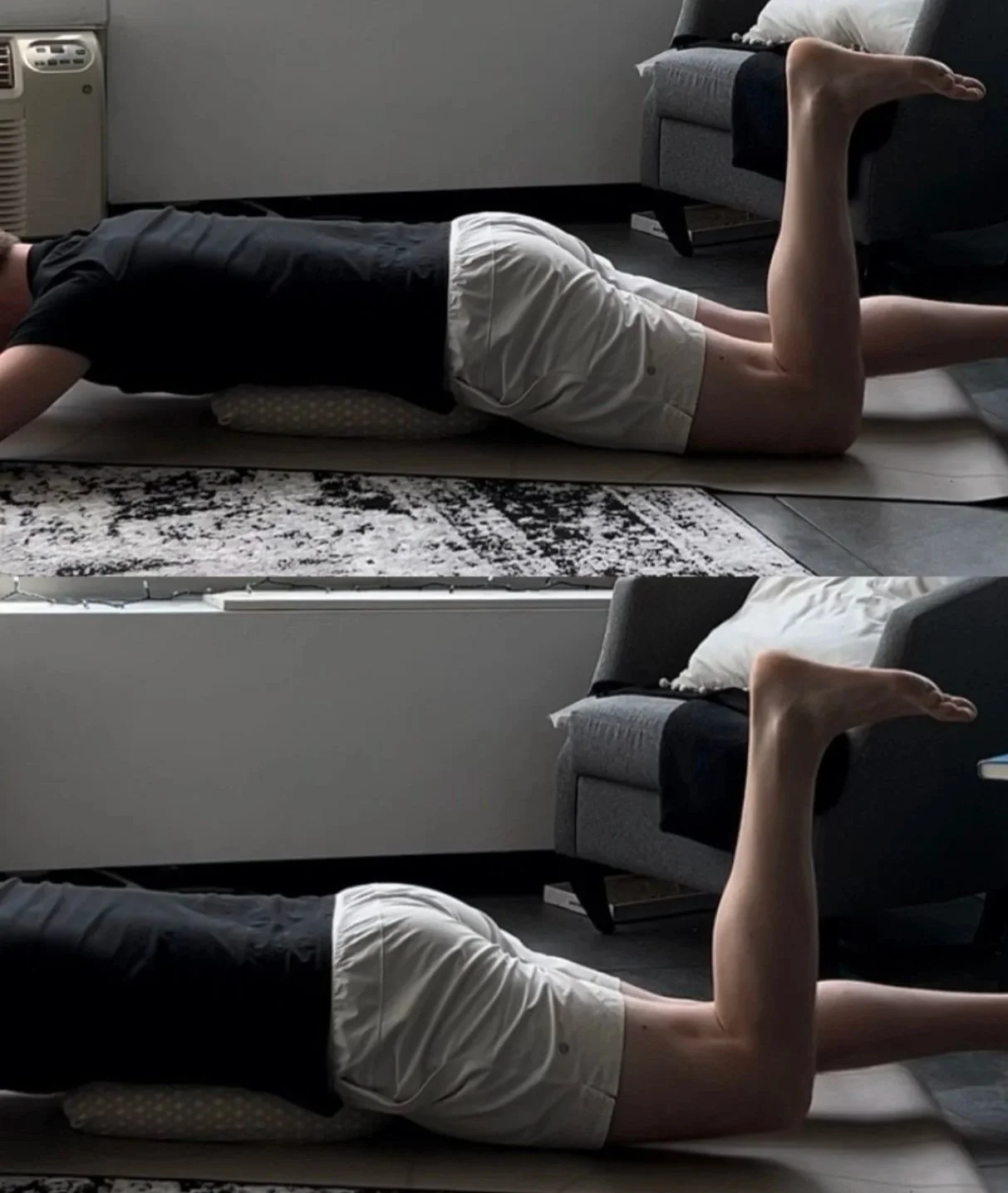 The movement is very small—maybe an inch or two. Focus on squeezing your glute, not arching your back. If your back moves, reset and use less range of motion. Repeat 10 times on each side daily.